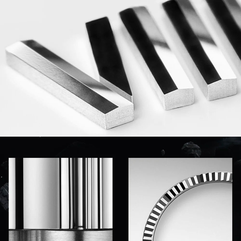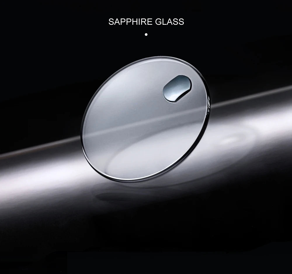 Vidro de safira para transparência duradoura, coroa rosqueada e vedação de 10 ATM garantem robustez real no uso cotidiano. Na pulseira, elos sólidos e fecho com botão oculto preservam linhas limpas e conforto de uso.