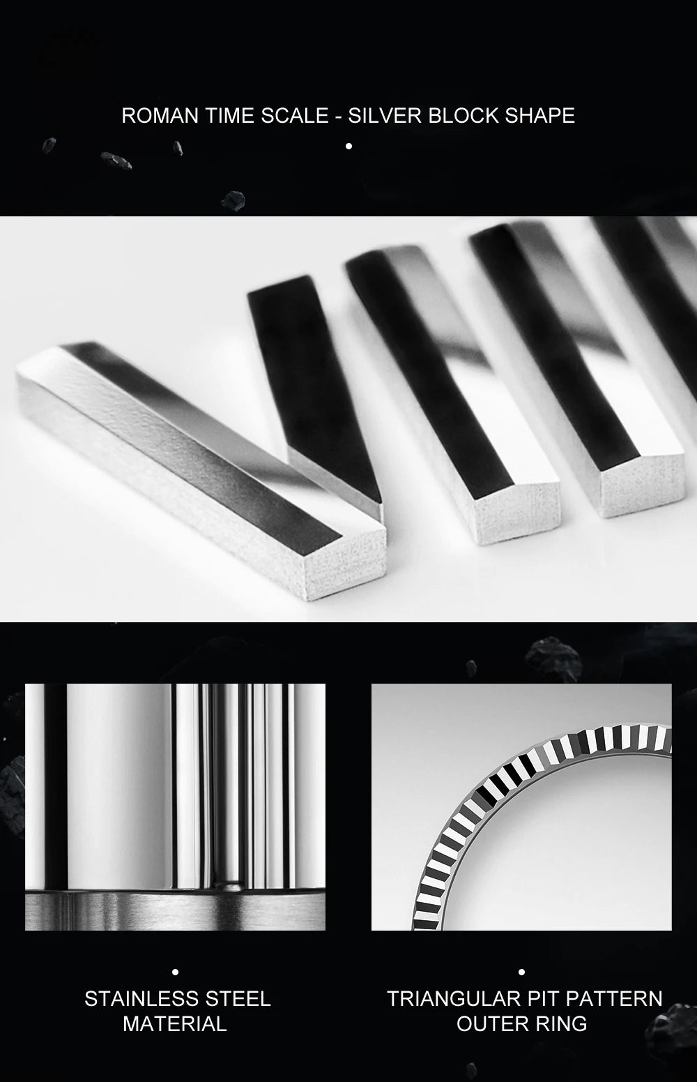 - Detalhes: Marcadores metálicos (romanos) • Ponteiros luminosos